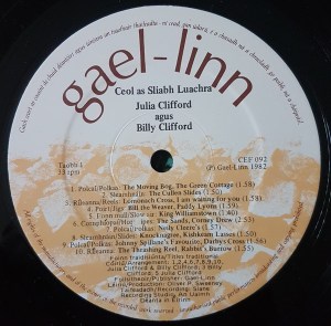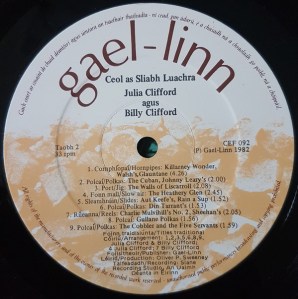 An exceptional album, mostly featuring duets played by the Sliabh Luachra fiddle player Julia Clifford, and her son Billy. One of the album’s most remarkable charms is the way in which Billy’s flute matches exactly the rhythm, phrasing, and ornamentation of his mother’s fiddle on the many sets of Sliabh Luachra slides and polkas that they play together. In many respects it is the way in which Billy plays the fiddle on the flute that makes his music here so distinctive and so wonderful to hear, and the closeness of the communication between the two musicians is truly exceptional. Together with The Star Above the Garter, and Denis Doody’s Kerry Music, this is one of my all-time favourite recordings of Sliabh Luachra music. — Robert Ryan