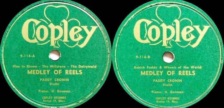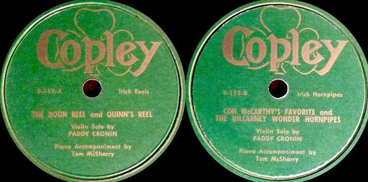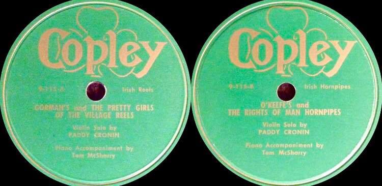 After Ellen’s death in 1926, one son, James, inherited the New York store, and another son, Justus Jr., moved to Boston to open his own enterprise under the O’Byrne Dewitt name at 51 Warren Street, Roxbury. The O’Byrne DeWitt business flourished in Boston as it had in New York: an unlikely hybrid of travel agent/music shop. Under a new label, Copley, he soon began recording some of the local talent, and in the early 1950s, Paddy Cronin recorded a number of sides (solo fiddle with piano except for a few duets with flute player Frank Neylon) that became very popular and were essential in creating his worldwide reputation as a musician of note.