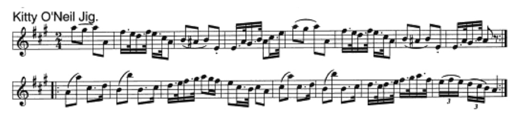 The third and fourth parts come from Kitty O’Neil’s Jig which was published in 1869 in Howe’s 1000 Jigs and Reels (and was later developed into the seven-part Kitty O’Neil’s Champion Sand Jig in Ryan’s book.)