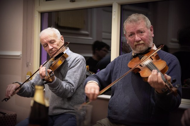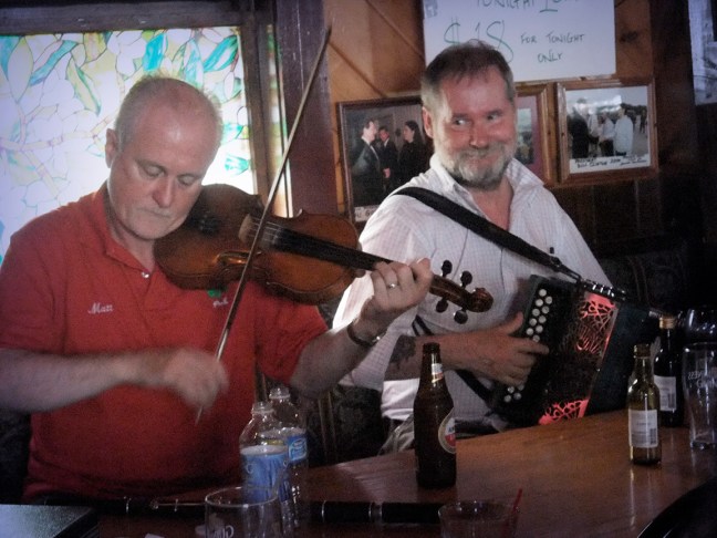 Matt Cranitch and Jackie Daly at a session in Furlong’s at the Catskills Irish Arts Week
